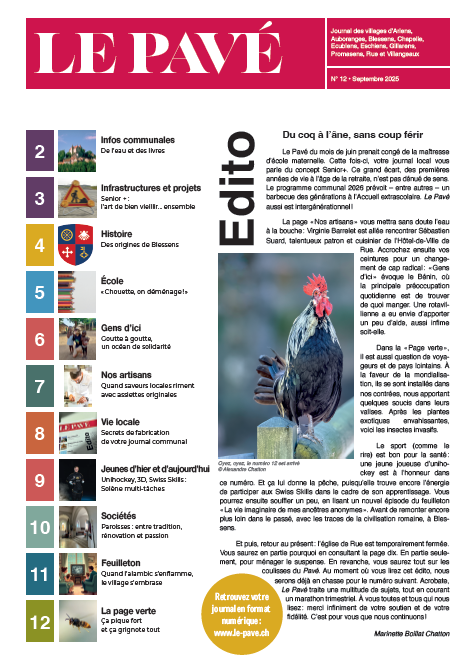 Le sport (comme le rire) est bon pour la santé : une jeune joueuse d’unihockey est à l’honneur dans ce numéro. Et ça lui donne la pêche, puisqu’elle trouve encore l’énergie de participer aux Swiss Skills dans le cadre de son apprentissage. Vous pourrez ensuite souffler un peu, en lisant un nouvel épisode du feuilleton « La vie imaginaire de mes ancêtres anonymes ». Avant de remonter encore plus loin dans le passé, avec les traces de la civilisation romaine, à Blessens.